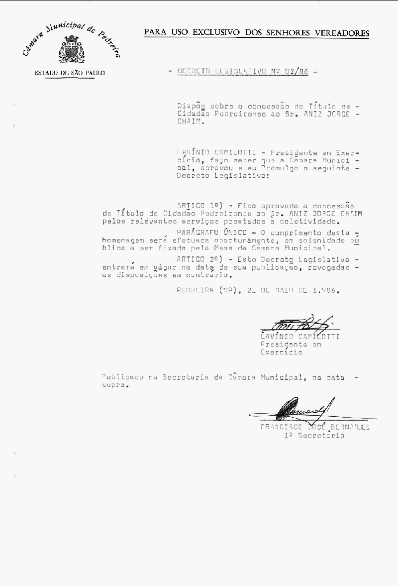 Ementa: Dispõe sobre a concessão de Título de Cidadão Pedreirense ao Sr. Aniz Jorge Chaim