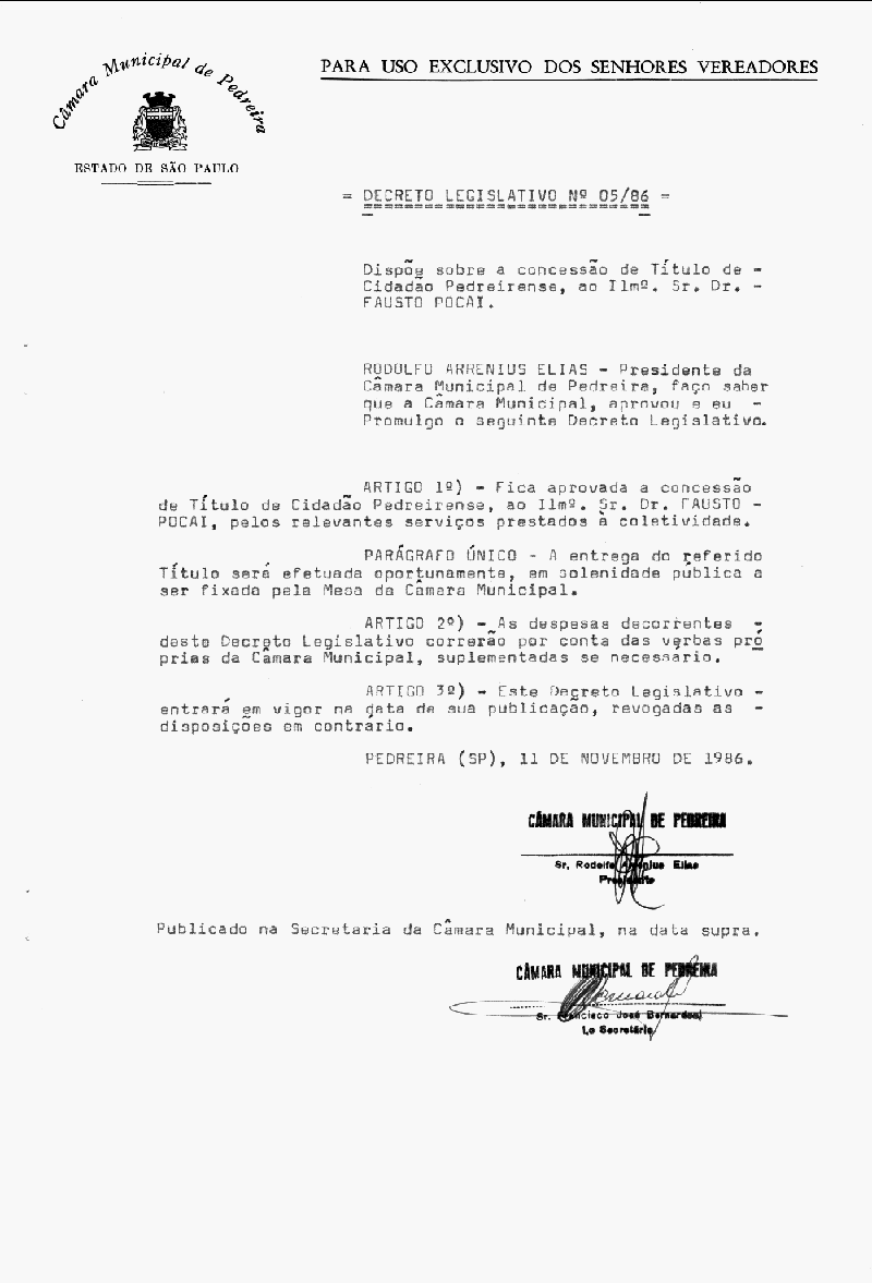 Ementa: Dispõe sobre a concessão de Título de Cidadão Pedreirense, ao Ilm°. Sr. Dr. Fausto Pocai