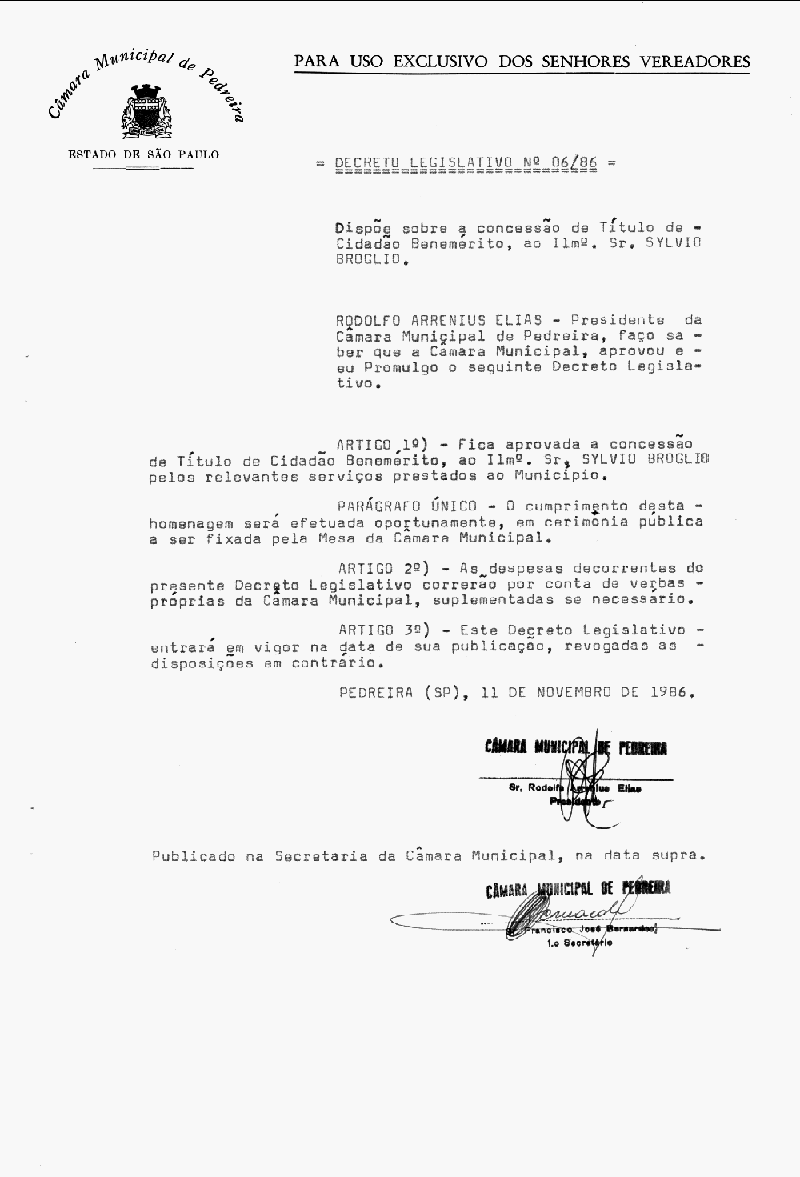 Ementa: Dispõe sobre a concessão de Título de Cidadão Benemérito, ao Ilm°. Sr. Sylvio Broglio