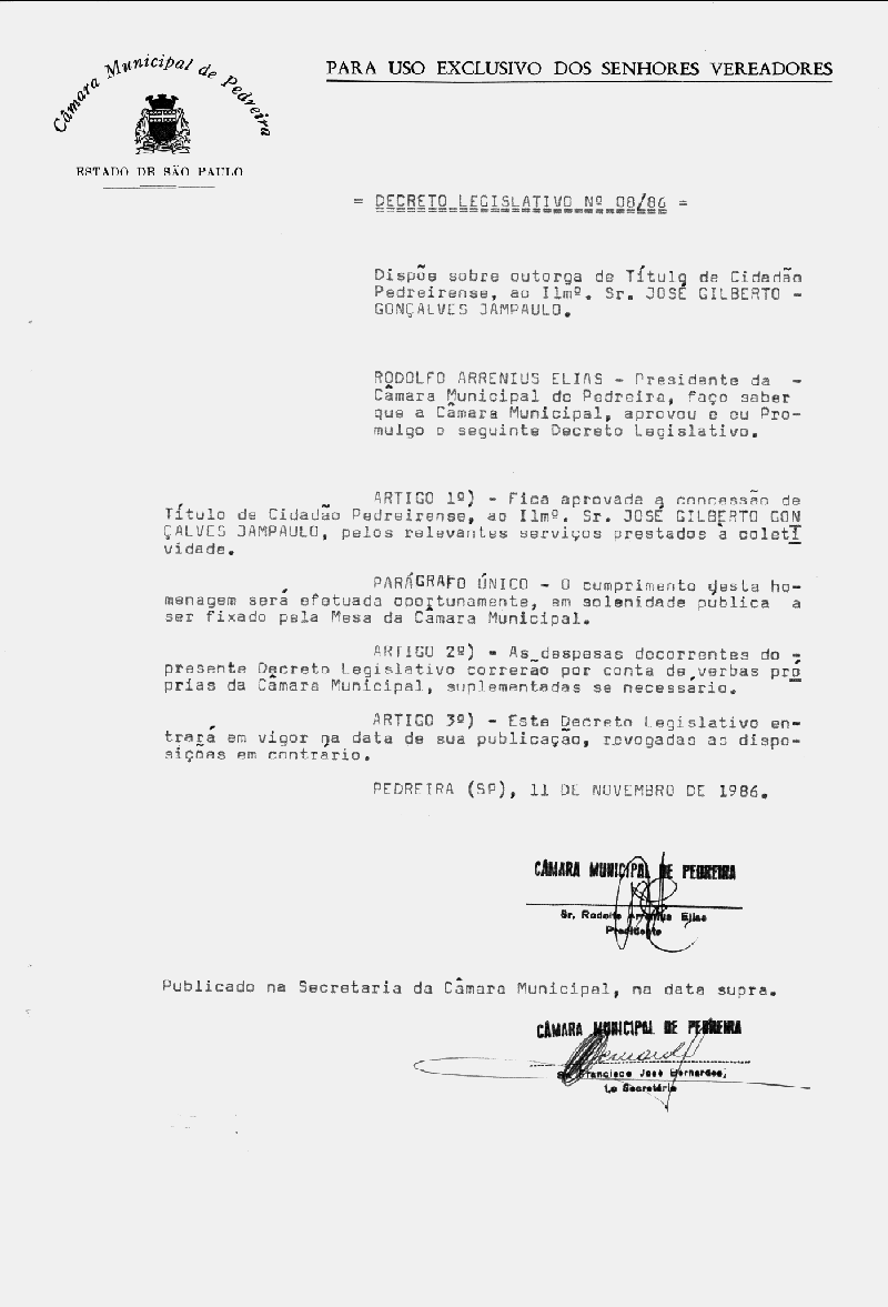 Ementa: Dispõe sobre outorga de título de Cidadão Pedreirense, ao Ilm°. Sr. José Gilberto Gonçalves Jampaulo