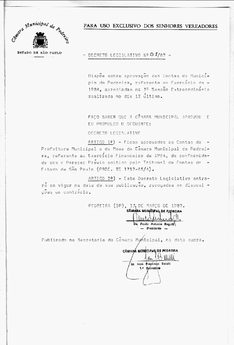 Ementa: Dispõe sobre aprovação das Contas do Município de Pedreira, referente ao Exercício de 1984.