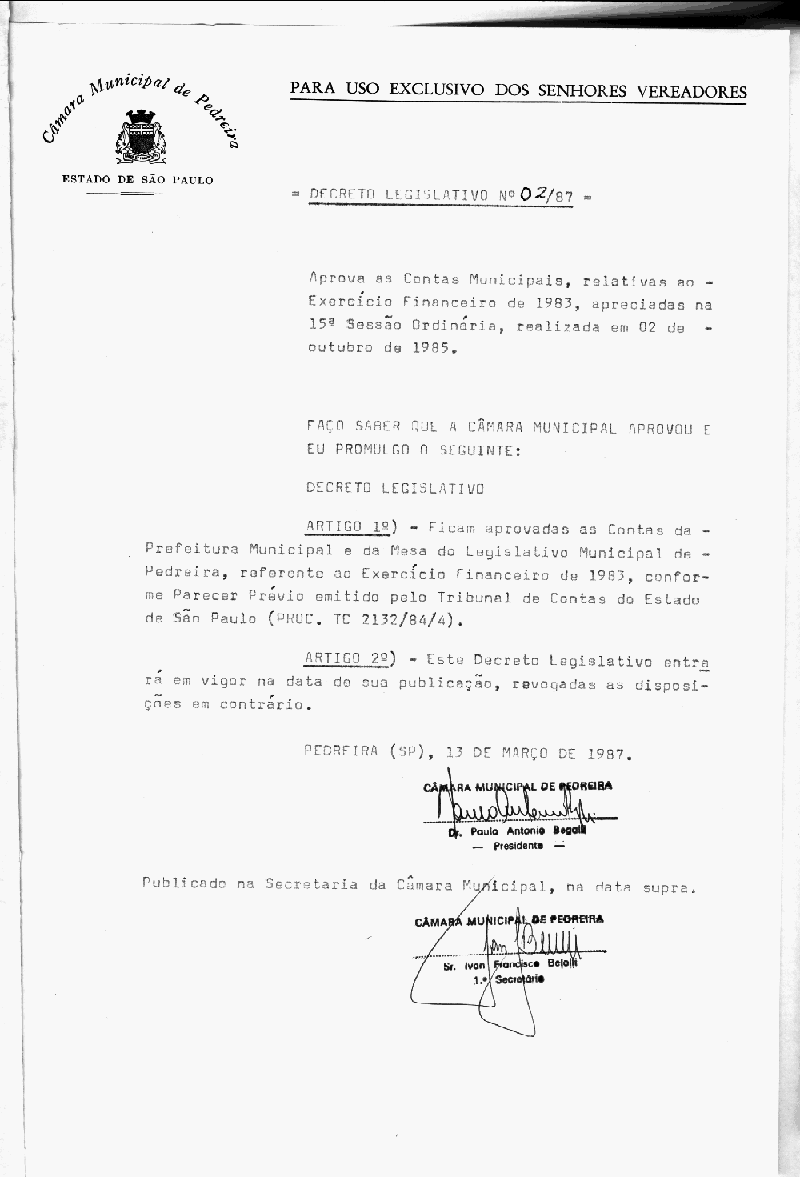 Ementa: Aprova a Contas Municipais, relativas ao Exercício Financeiro de 1983.