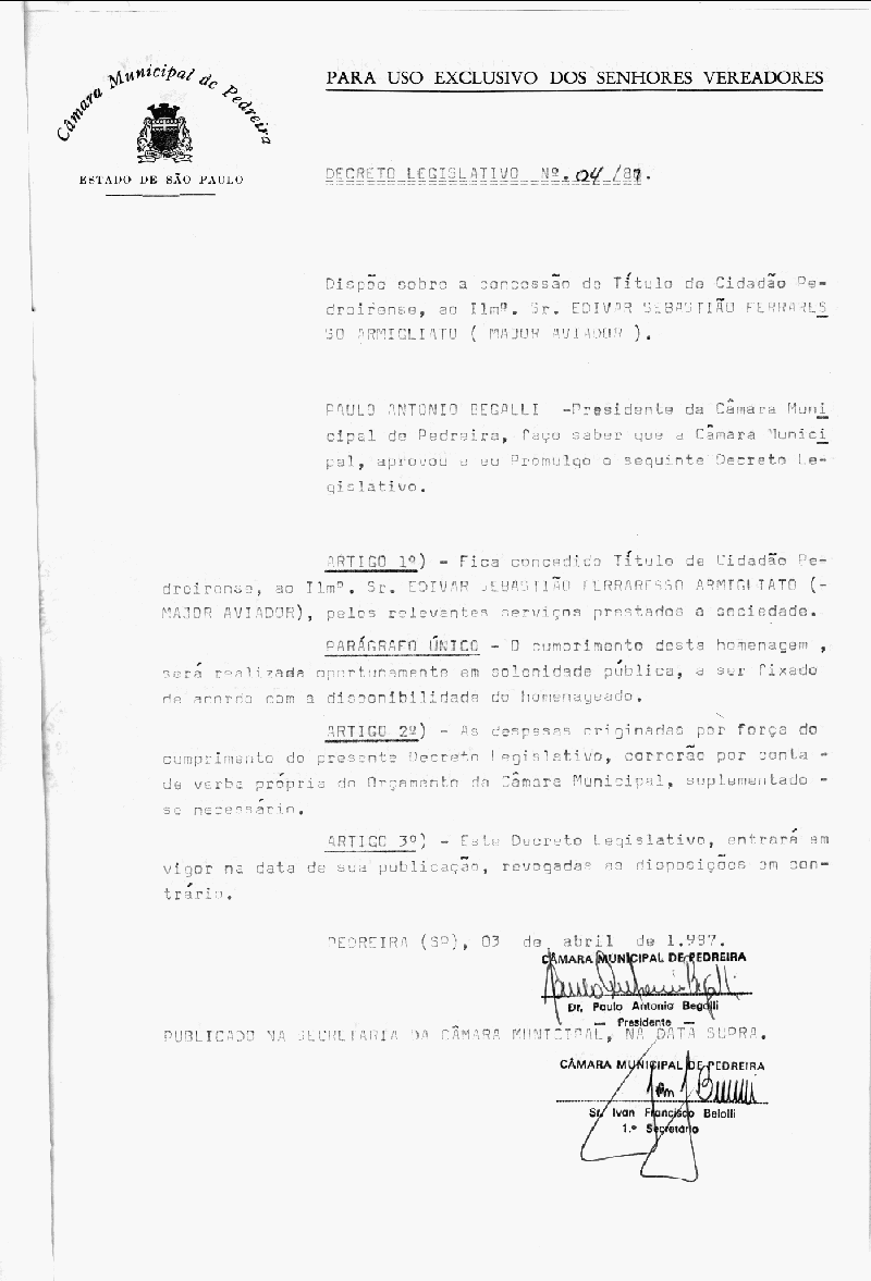 Ementa: Dispõe sobre a concessão de Título de Cidadão Pedreirense, ao Ilm°. Sr. Edivar Sebastião Ferraresso Armigliato (Major Aviador)