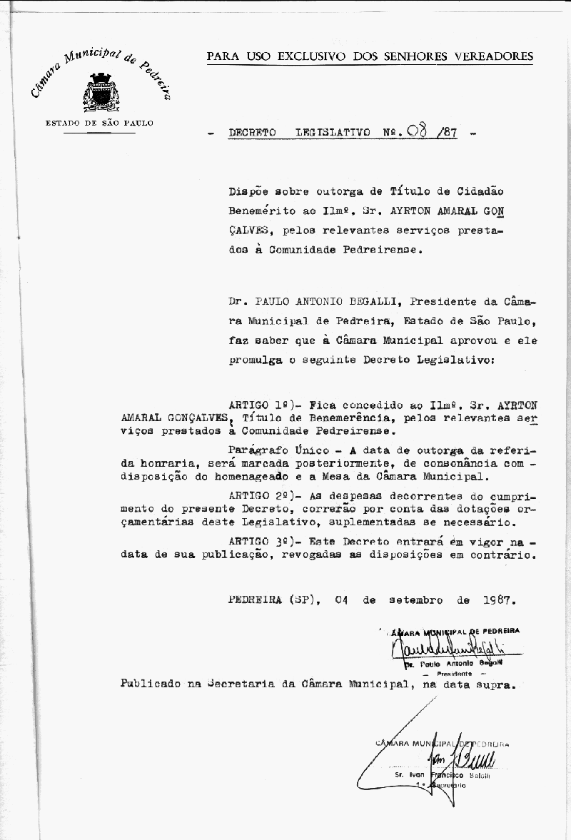Ementa: Dispõe sobre outorga de título de cidadão Benemérito ao Ilm°. sr. Ayrton Amaral Gonçalves, pelos relevantes serviços prestados à Comunidade Pedreirense