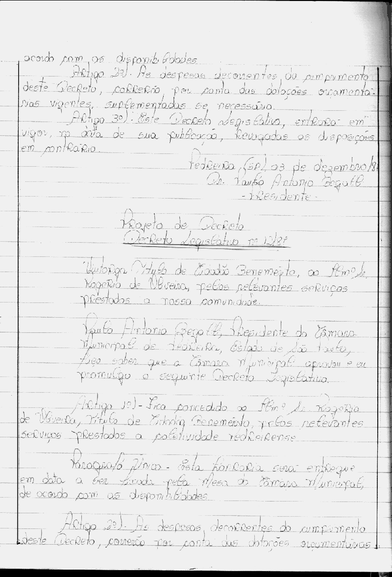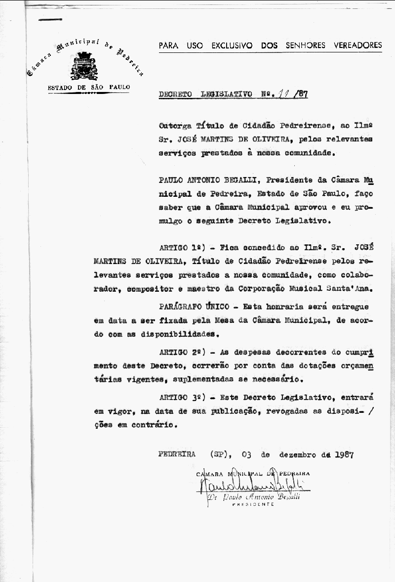 Ementa: Outorga título de cidadão Pedreirense, ao Ilm°. Sr. José Martins de Oliveira, pelos serviços prestados à nossa comunidade