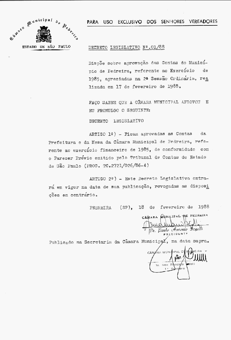 Ementa: Dispõe sobre aprovação das contas do Município de Pedreira, referente ao Exercício de 1985.