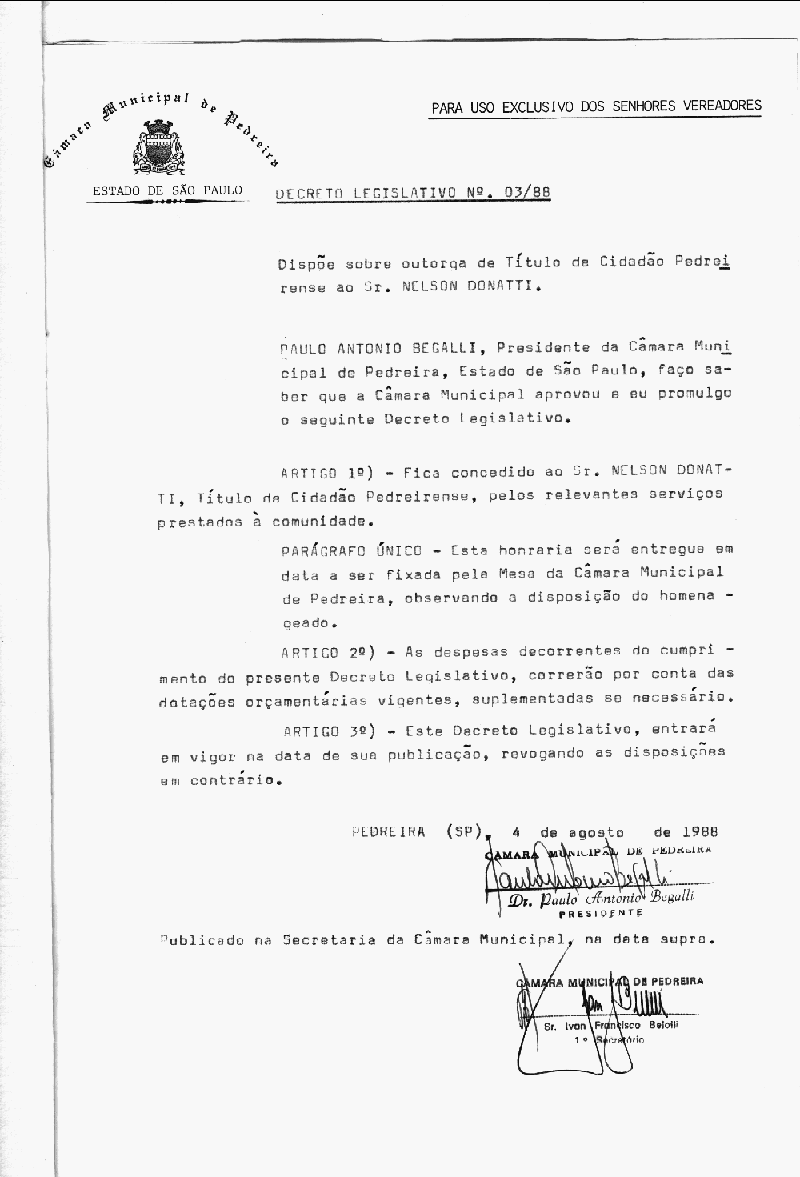 Ementa: Dispõe sobre outorga de título de Cidadão Pedreirense ao Sr. Nelson Donatti