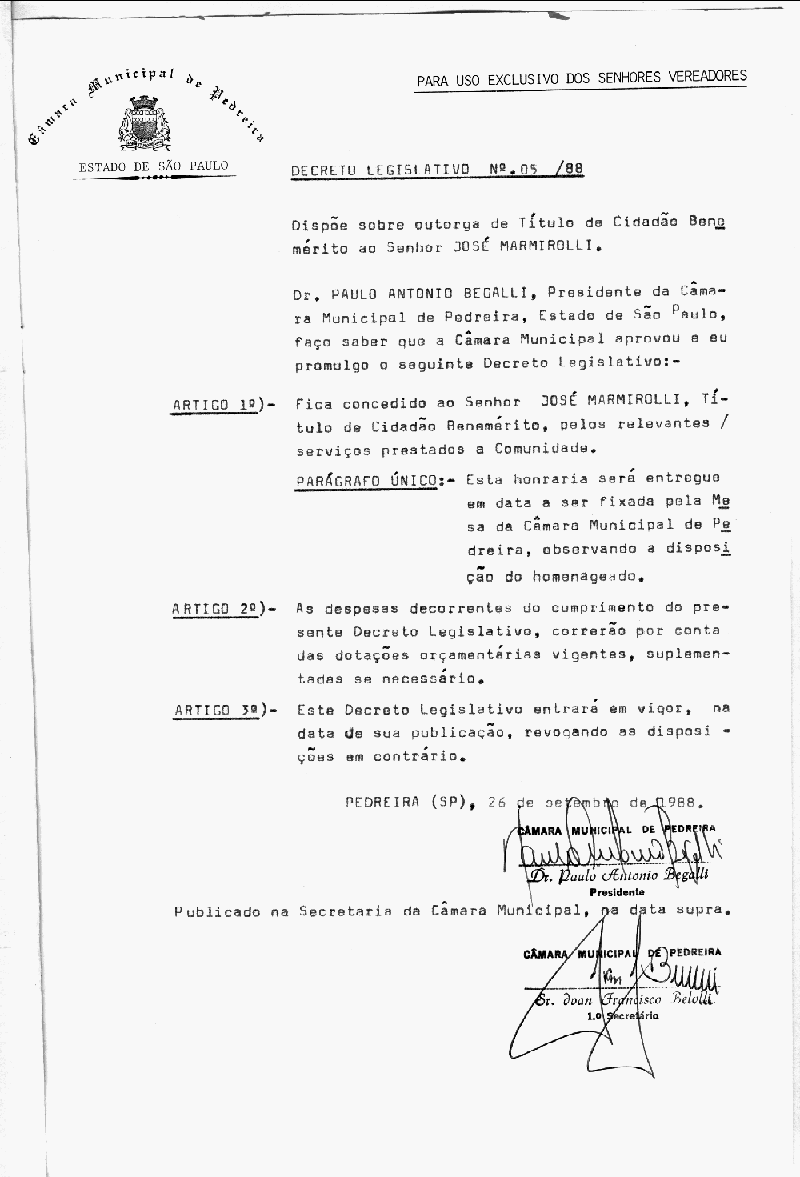 Ementa: Dispõe sobre outorga de titulo de cidadão Benemérito ao Sr. José Marmirolli