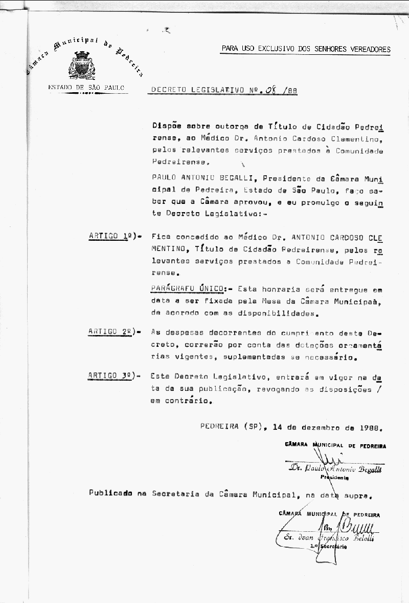 Ementa: Dispõe sobre outorga de título de cidadão Pedreirense, ao Médico Dr. Antonio Cardoso Clementino, pelos serviços relevantes serviços prestados à comunidade Pedreirense