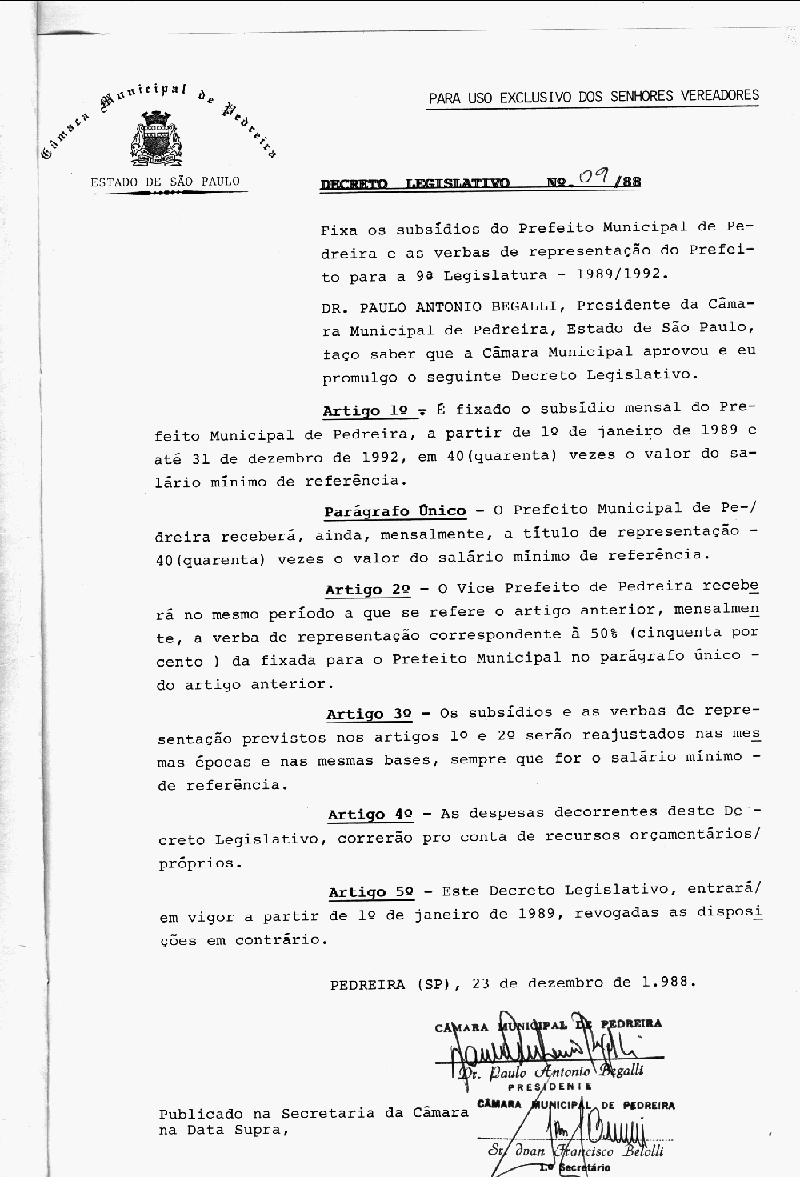 Ementa: Fixa subsídios do Prefeito Municipal de Pedreira e as verbas de representação do Prefeito para a 9° Legislatura - 1989 - 1992