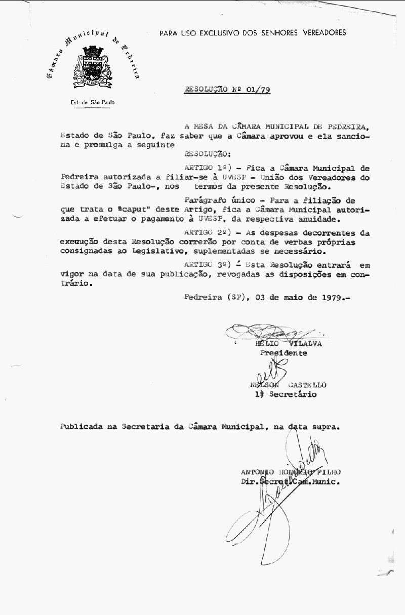 Ementa: Artigo 1º - Fica a Câmara Municipal de Pedreira autorizada a filiar-se à UVESP - União dos Vereadores do Estado de São Paulo, nos termos da presente resolução.