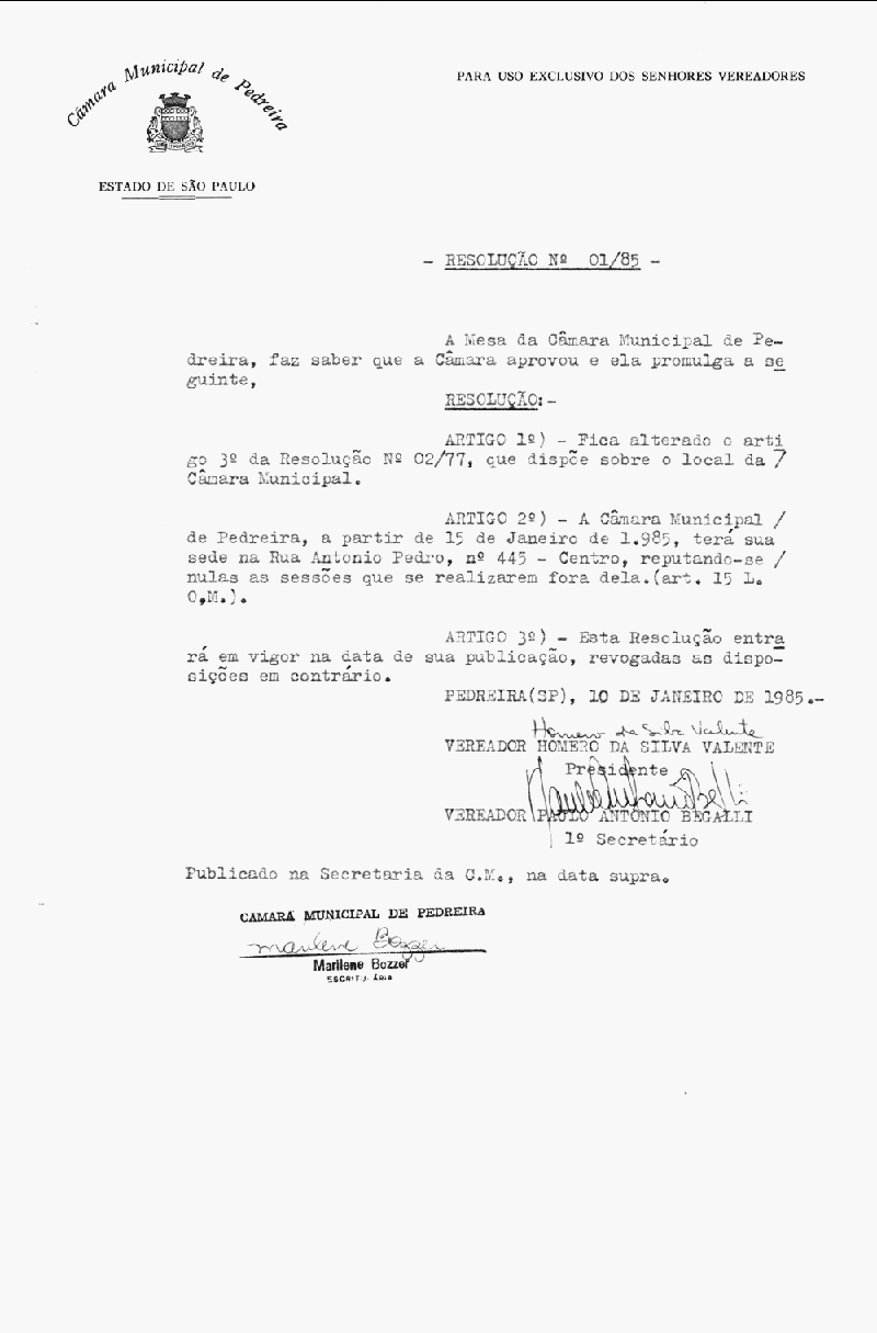 Ementa: Artigo 1º - Fica alterado o artigo 3º da Resolução nº 02/77, que dispõe sobre o local da Câmara Municipal.