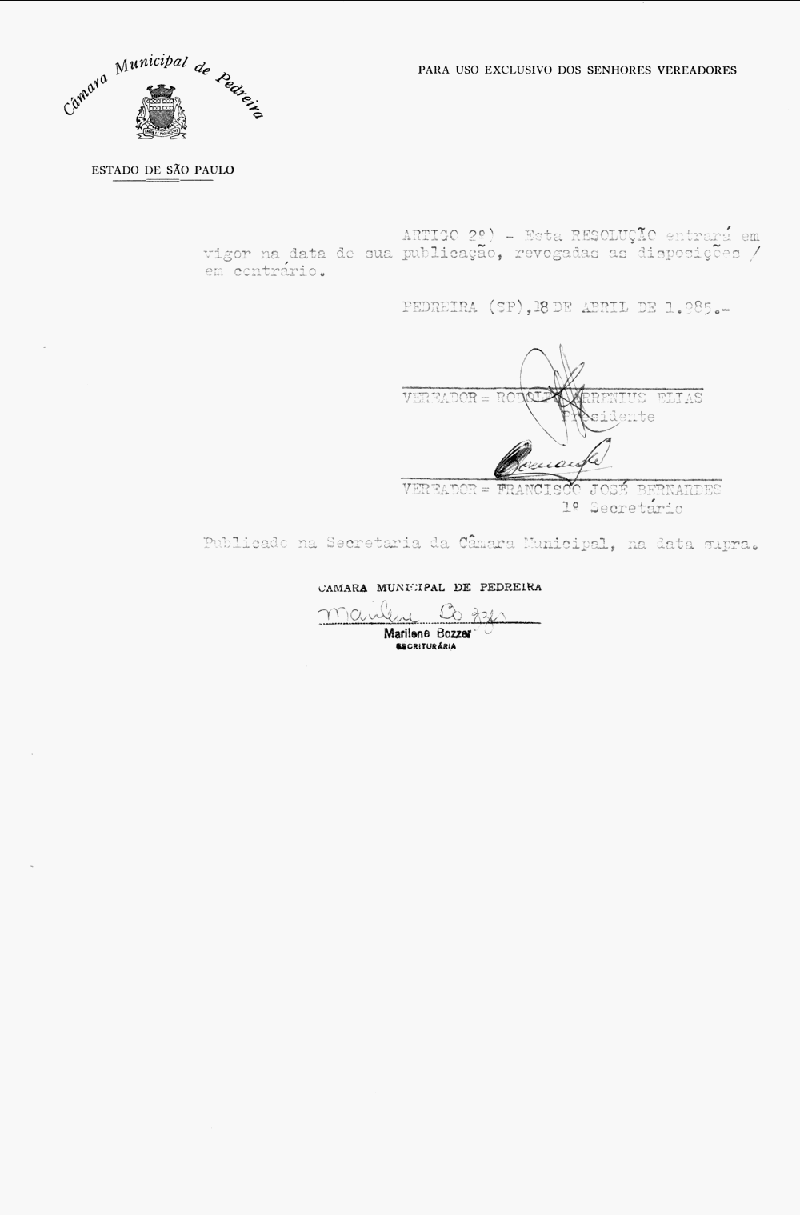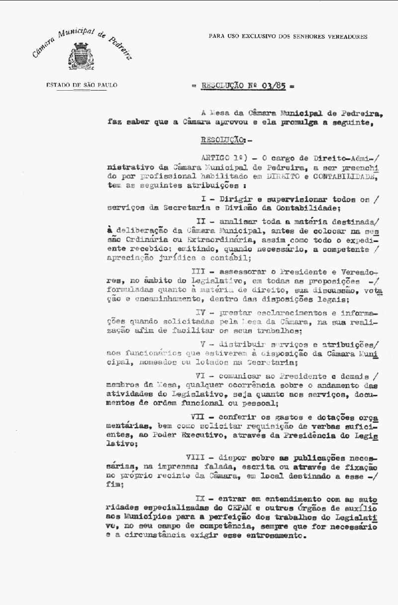 Ementa: Artigo 1º - O cargo de Direito-Administrativo da Câmara Municipal de Pedreira, a ser preenchido por profissional habilitado em Direito e Contabilidade, tem as seguintes atribuições.