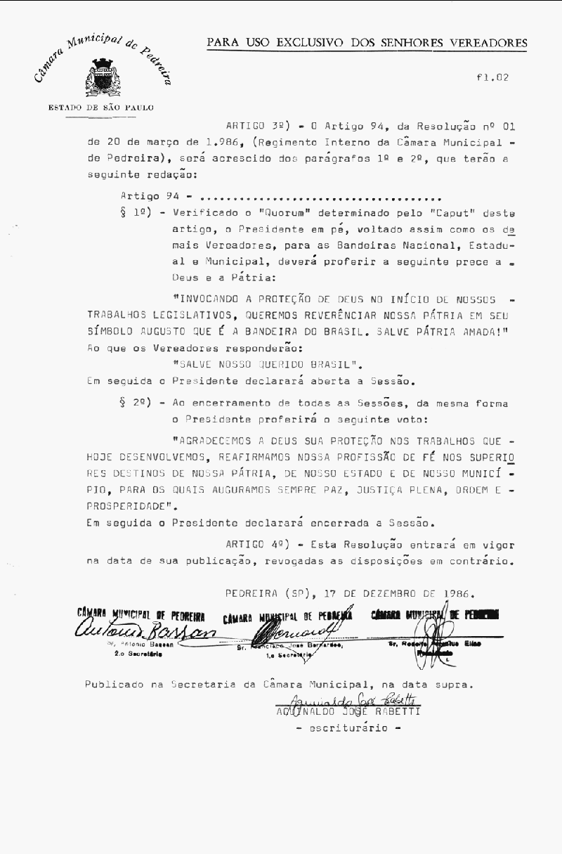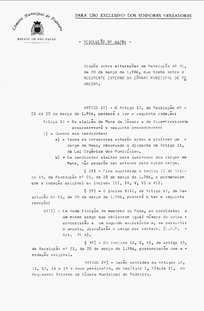 Ementa: Dispõe sobre alterações da resolução nº 01, de 20 de março de 1986, que trata sobre o Regimento Interno da Câmara Municipal de Pedreira.