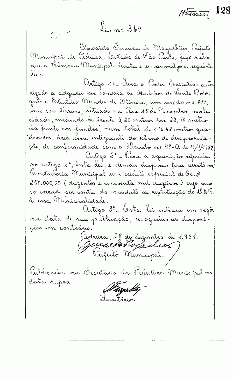 Lei Municipal - N° 364 de 28/12/1961