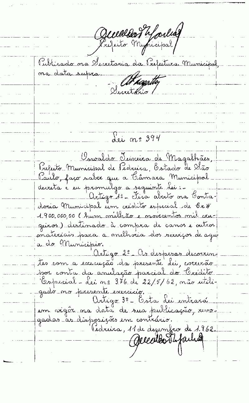 Lei Municipal - N° 394 de 11/12/1962