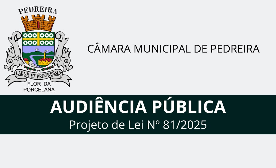 A câmara municipal de pedreira, atendendo o disposto na constituição federal e no art. 48 e seu § 1º, inciso i, da lei complementar nº 101/2000, convoca a comunidade em geral para participar da Audiência Pública a ser realizada às 18h30 (dezoito horas e trinta minutos) do dia 5 (cinco) de novembro de 2025 (quarta-feira), na sede da câmara municipal de pedreira, situada na rua professor joão alvarenga, 75, centro, pedreira – sp., com o objetivo de discutir o planejamento da aplicação dos recursos do município, proporcionando aos cidadãos a oportunidade de formular sugestões e opiniões referentes ao Projeto de Lei nº81/25 – prefeito municipal – estima a receita e fixa a despesa do município de pedreira para o exercício de 2026.