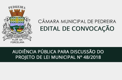 O PODER LEGISLATIVO DE PEDREIRA, como instrumento de participação popular nos trabalhos legislativos, convoca AUDIÊNCIA PÚBLICA a realizar-se no dia 09 de agosto de 2018, a partir das 19 horas, no Plenário da Câmara Municipal de Pedreira, situado na R. Professor João Alvarenga, 75, Centro, Pedreira - SP., para debates sobre o Projeto de Lei Municipal nº 48/2018 que "PROÍBE A FABRICAÇÃO, TRANSPORTE, COMERCIALIZAÇÃO, DOAÇÃO, MANUSEIO E UTILIZAÇÃO DE FOGOS DE ARTIFÍCIO, BOMBAS E OUTROS ARTEFATOS PIROTÉCNICOS QUE PRODUZAM ESTAMPIDOS, NO MUNICÍPIO DE PEDREIRA E DÁ OUTRAS PROVIDÊNCIAS" de autoria dos Vereadores Márcia Regina Lima Galvão e José Carlos da Silva.