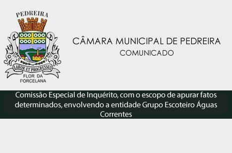 JOSÉ LUIS NIERI, Presidente da Câmara Municipal de Pedreira, Estado de São Paulo, usando das atribuições que lhes são conferidas por Lei(Artigo 19, inciso I, alínea "b", do RegimentoInterno) e considerando o Requerimento nº. 69/18, que instaurou Comissão Especial de Inquérito, com o escopo de apurar fatos determinados, envolvendo a entidade Grupo Escoteiro Águas Correntes 273/SP, sob CNPJ 04.651.225/0001-69, a qual teria, em tese, praticado possíveis irregularidades em seus gastos, contrariando aos princípios básicos da Administração Pública.