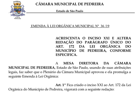 A MESA DIRETORA DA CÂMARA MUNICIPAL DE PEDREIRA, Estado de São Paulo, usando de suas atribuições legais, faz saber que o Plenário da Câmara Municipal aprovou e ela promulga a seguinte Emenda à Lei Orgânica:
