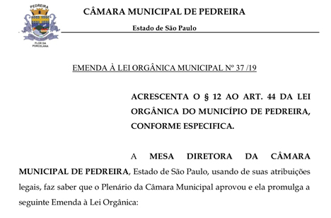 A MESA DIRETORA DA CÂMARA MUNICIPAL DE PEDREIRA, Estado de São Paulo, usando de suas atribuições legais, faz saber que o Plenário da Câmara Municipal aprovou e ela promulga a seguinte Emenda à Lei Orgânica: