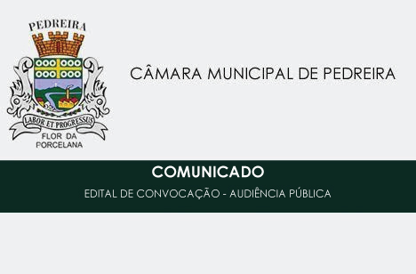 O PRESIDENTE DA CÂMARA MUNICIPAL DE PEDREIRA, DR. JAYRO GOUVEIA GOULART FILHO, ATENDENDO O DISPOSTO NA CONSTITUIÇÃO FEDERAL E NO ART. 48 E SEU § 1º, INCISO I, DA LEI COMPLEMENTAR Nº 101/2000, CONVOCA A COMUNIDADE EM GERAL PARA PARTICIPAR DA AUDIÊNCIA PÚBLICA A SER REALIZADA ÀS 18H (DEZOITO HORAS) DO DIA 29 (VINTE E NOVE) DE MAIO DE 2019 (QUARTA-FEIRA), NA SEDE DA CÂMARA MUNICIPAL DE PEDREIRA, SITUADA NA RUA PROFESSOR JOÃO ALVARENGA, 75, CENTRO, PEDREIRA – SP., COM O OBJETIVO DE DISCUTIR O PLANEJAMENTO DA APLICAÇÃO DOS RECURSOS DO MUNICÍPIO, PROPORCIONANDO AOS CIDADÃOS A OPORTUNIDADE DE FORMULAR SUGESTÕES E OPINIÕES REFERENTES AO PROJETO DE LEI Nº 42/19 – PREFEITO MUNICIPAL – ESTABELECE AS DIRETRIZES A SEREM OBSERVADAS NA ELABORAÇÃO DA LEI ORÇAMENTÁRIA DO MUNICÍPIO DE PEDREIRA PARA O EXERCÍCIO DE 2020 E DÁ OUTRAS PROVIDÊNCIAS.