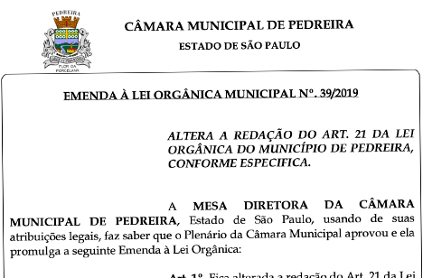 A MESA DIRETORA DA CÂMARA MUNICIPAL DE PEDREIRA, Estado de São Paulo, usando de suas atribuições legais, faz saber que o Plenário da Câmara Municipal aprovou e ela promulga a seguinte Emenda à Lei Orgânica: