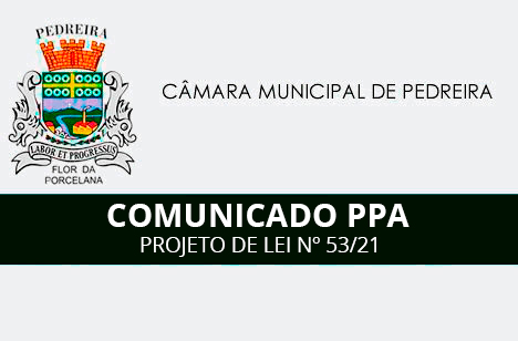 A CÂMARA MUNICIPAL DE PEDREIRA, INFORMA QUE JÁ SE ENCONTRA JUNTO À SECRETARIA ADMINISTRATIVA, PARA CONHECIMENTO E ANÁLISE DOS SENHORES VEREADORES, BEM COMO DE TODA A POPULAÇÃO PEDREIRENSE, O PROJETO DE LEI Nº 53/21 – DISPÕE SOBRE O PLANO PLURIANUAL PARA O QUADRIÊNIO DE 2022/2025 E DÁ OUTRAS PROVIDÊNCIAS.