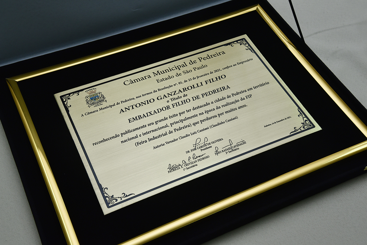 A Câmara Municipal de Pedreira realizou sua 3ª Sessão Solene do presente exercício, outorgando o Título de “Embaixador Filho de Pedreira” ao Empresário Toninho Ganzarolli, ocorrida na terça-feira, dia 14 de dezembro de 2021.