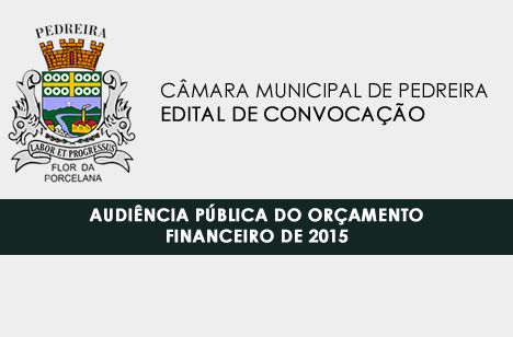 O Presidente da Câmara Municipal de Pedreira, ALESSANDRO LUIS DE GODOY, atendendo o disposto na Constituição Federal e no art. 48 da Lei Complementar nº 101/2000, CONVOCA a comunidade em geral para participar da audiência pública a ser realizada às 9h (nove horas) do dia 30 de outubro de 2014 (quinta-feira), na sede da Câmara Municipal de Pedreira, situada na Rua Professor João Alvarenga, 75, Centro, Pedreira – SP., com o objetivo de expor o planejamento da aplicação dos recursos no município, proporcionando aos cidadãos a oportunidade de formular sugestões e opiniões referente o PROJETO DE LEI Nº 76 /14 - PREFEITO MUNICIPAL - ESTIMA A RECEITA E FIXA A DESPESA DO MUNICÍPIO DE PEDREIRA PARA O EXERCÍCIO DE 2015.