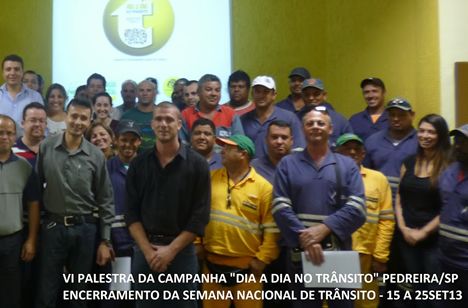 Na última quarta feira (25/09/2013) aconteceu no auditório da ACE Pedreira, a VI Palestra da Campanha Dia a Dia no Trânsito. Faz parte do cronograma de palestras 2013, porém esta em particular teve como objetivo principal a SEMANA NACIONAL DE TRÂNSITO (18 a 25/09) contou com a participação de colaboradores da Secretária de Saúde, Departamento de Trânsito e Secretária de Governo da Prefeitura Municipal de Pedreira, Canola Seguros, Construtora Ferreira Guedes, Ortega Transportes, Associação Comercial e Empresarial de Pedreira e um grande número de cidadãos.