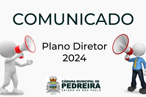 SR. JOSÉ LUIS NIERI, NA QUALIDADE DE PRESIDENTE DA CÂMARA MUNICIPAL DE PEDREIRA, INFORMA QUE JÁ SE ENCONTRA JUNTO À SECRETARIA ADMINISTRATIVA E NO SITE DA CÂMARA MUNICIPAL PARA CONHECIMENTO E ANÁLISE DOS SENHORES VEREADORES, BEM COMO DE TODA A POPULAÇÃO PEDREIRENSE, O PROJETO DE LEI COMPLEMENTAR Nº 04/24 – PREFEITO MUNICIPAL – APROVA O PLANO DIRETOR DO MUNICÍPIO DE PEDREIRA E DÁ OUTRAS PROVIDÊNCIAS.