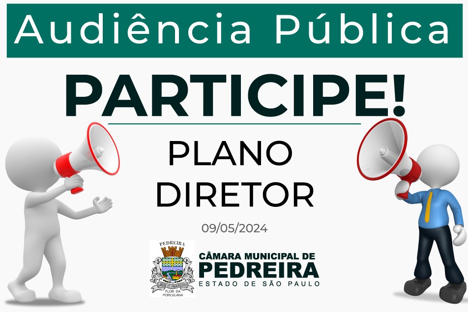 O PRESIDENTE DA CÂMARA MUNICIPAL DE PEDREIRA, SR. JOSÉ LUIS NIERI, ATENDENDO O DISPOSTO NA CONSTITUIÇÃO FEDERAL E NO ART. 48 E SEU § 1º, INCISO I, DA LEI COMPLEMENTAR Nº 101/2000, CONVOCA A COMUNIDADE EM GERAL PARA PARTICIPAR DA AUDIÊNCIA PÚBLICA A SER REALIZADA ÀS 18H (DEZOITO HORAS) DO DIA 09 DE MAIO (QUINTA-FEIRA), NA SEDE DA CÂMARA MUNICIPAL DE PEDREIRA, SITUADA NA RUA PROFESSOR JOÃO ALVARENGA, 75, CENTRO, PEDREIRA – SP., COM O OBJETIVO DE INCENTIVAR A PARTICIPAÇÃO POPULAR NO PROJETO DE LEI COMPLEMENTAR Nº 04/24 – PREFEITO MUNICIPAL – APROVA O PLANO DIRETOR DO MUNICÍPIO DE PEDREIRA E DÁ OUTRAS PROVIDÊNCIAS, DANDO OPORTUNIDADE AOS CIDADÃOS DE FORMULAR SUGESTÕES E OPINIÕES.