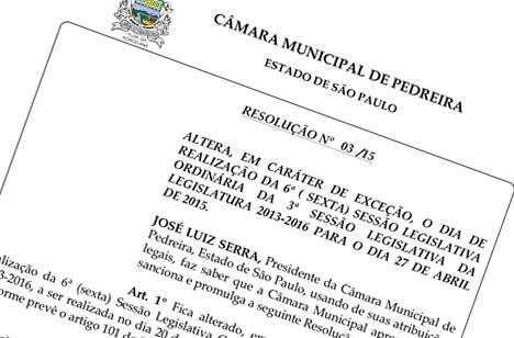 JOSÉ LUIZ SERRA, Presidente da Câmara Municipal de Pedreira, Estado de São Paulo, usando de suas atribuições legais, faz saber que a Câmara Municipal aprovou e ele sanciona e promulga a seguinte Resolução: