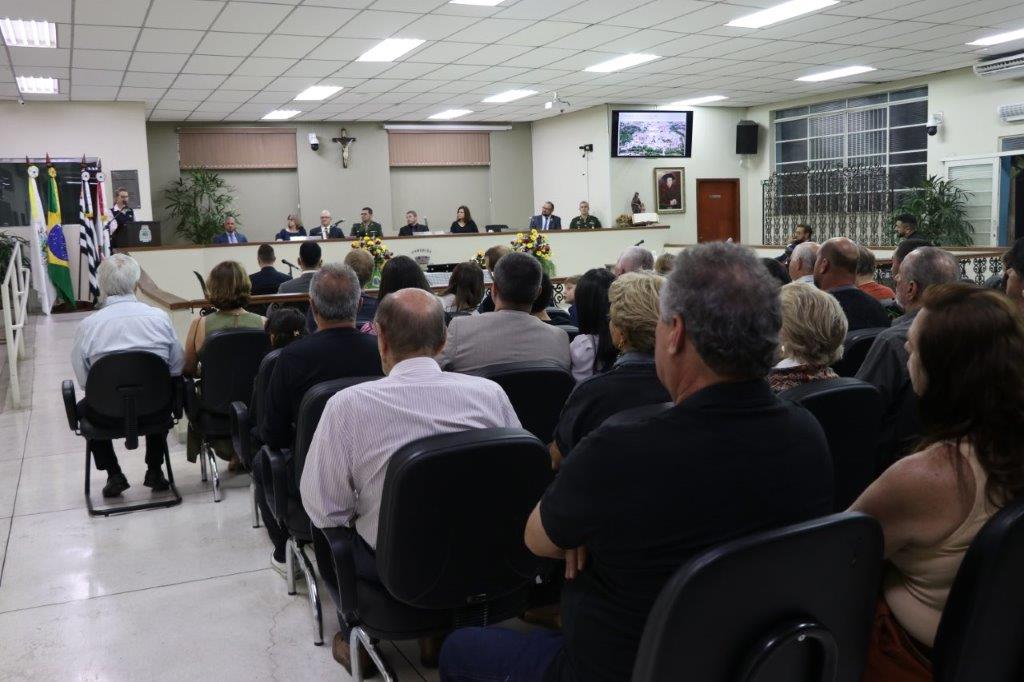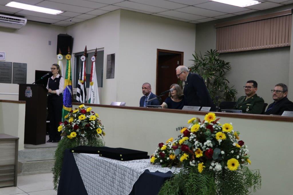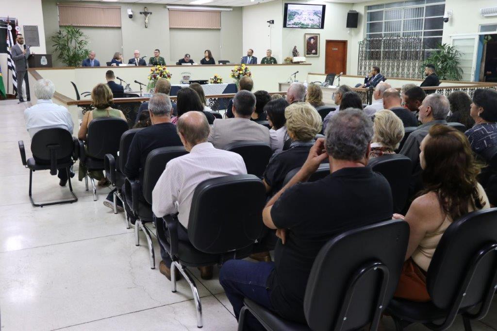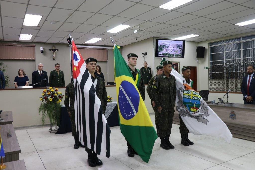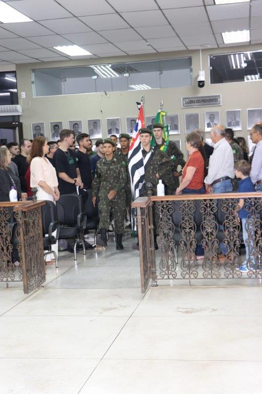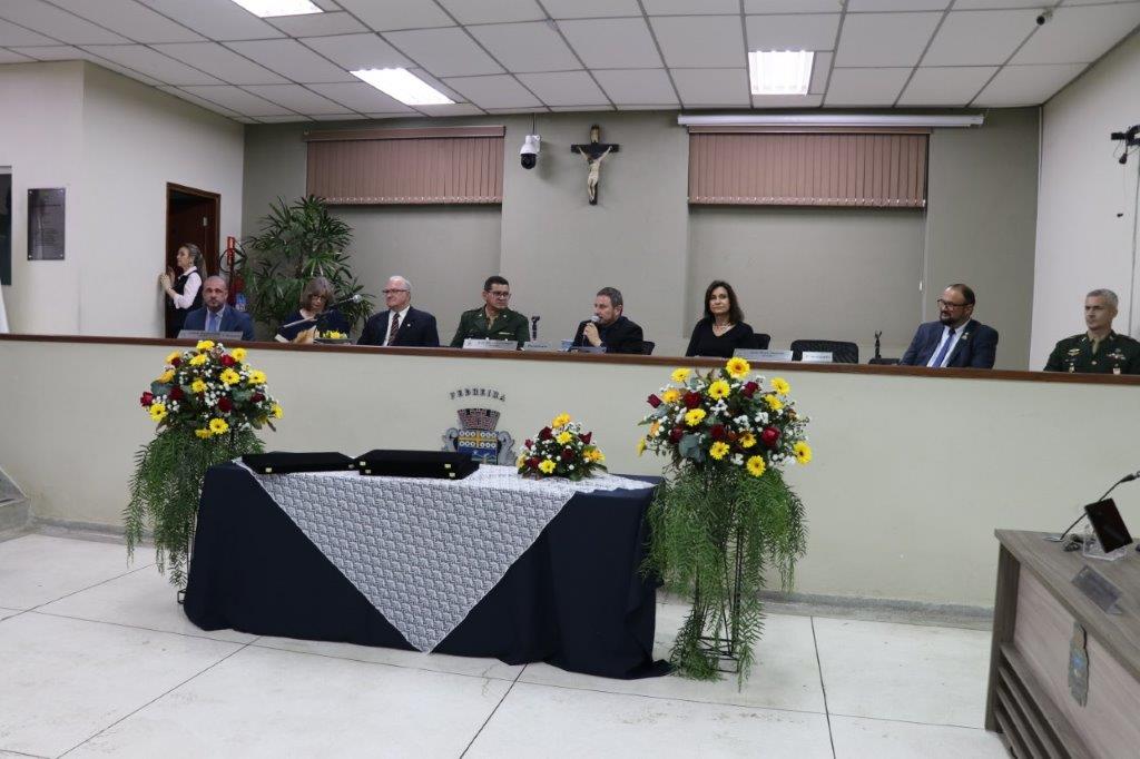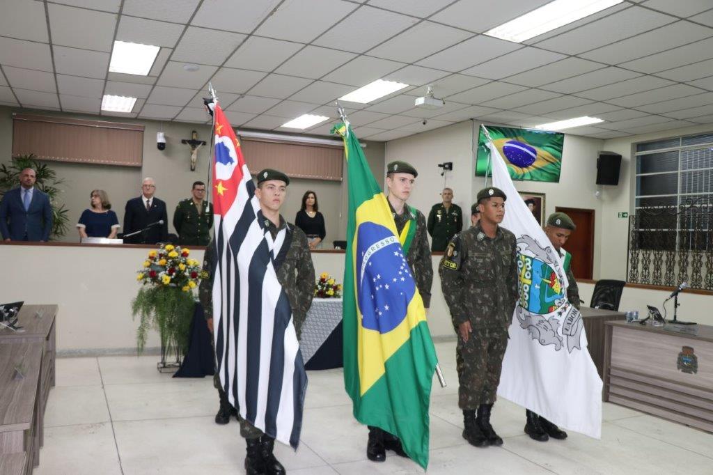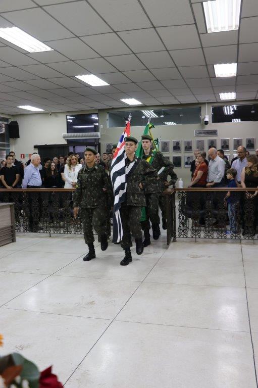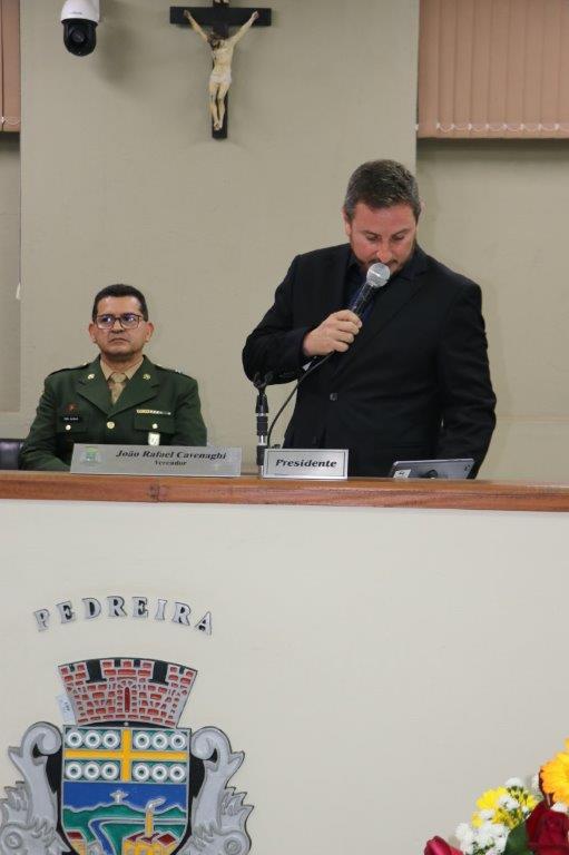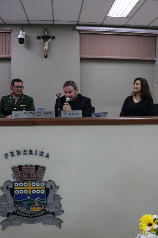 A Solenidade foi conduzida pelo Presidente João Rafael Cavenaghi, que fez a abertura da cerimônia agradecendo a presença de todos os convidados, especialmente dos homenageados e familiares. A Mesa Principal foi composta, além do Presidente da Casa, pelo 1º e 2º Secretários: Vereadores Leonardo Henrique Cirino e João Paulo Paulella; pela Vice-Prefeita Magda Bellix (representando o Prefeito Fábio Polidoro); pelos três homenageados e também pelo SubTenente – Chefe da Instrução do Tiro de Guerra 02-093 de Pedreira, Sr. Samoel Simão Bresolin.