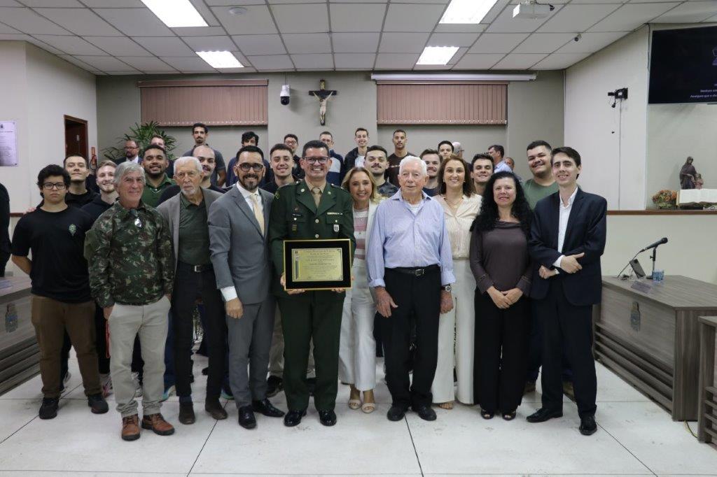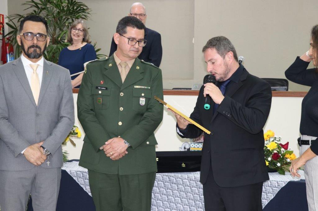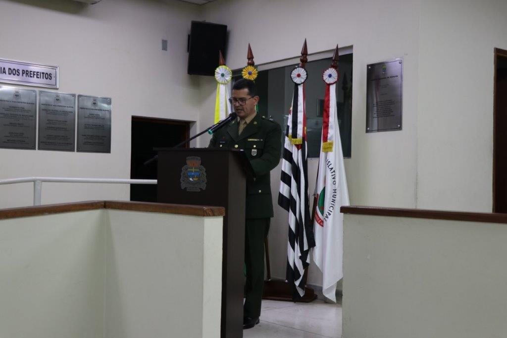 O Tenente Ajala fez seu pronunciamento, dizendo que estava muito orgulhoso de ser um cidadão pedreirense, agradecendo ao proponente da honraria, Vereador Jedson Panegassi e a todos os demais vereadores pela aprovação do Projeto. Agradeceu muito a maneira que foi acolhido por esta cidade desde que chegou aqui e que Pedreira valoriza muito cada cidadão. Dedicou esse Título primeiramente a Deus e ao Nosso Senhor Jesus Cristo pela proteção constante durante os anos que esteve a frente do TG, desde o início até o encerramento de sua missão aqui em Pedreira. Enfim, fez vários agradecimentos a todos que estiveram ao seu lado, pelo apoio e dedicação.