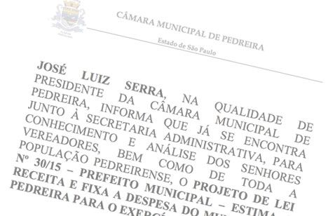 JOSÉ LUIZ SERRA, NA QUALIDADE DE PRESIDENTE DA CÂMARA MUNICIPAL DE PEDREIRA, INFORMA QUE JÁ SE ENCONTRA JUNTO À SECRETARIA ADMINISTRATIVA, PARA CONHECIMENTO E ANÁLISE DOS SENHORES VEREADORES, BEM COMO DE TODA A POPULAÇÃO PEDREIRENSE, O PROJETO DE LEI Nº 30/15 – PREFEITO MUNICIPAL – ESTIMA A RECEITA E FIXA A DESPESA DO MUNICÍPIO DE PEDREIRA PARA O EXERCÍCIO DE 2016.