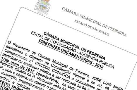 O Presidente da Câmara Municipal de Pedreira, JOSÉ LUIS NIERI, atendendo o disposto na Constituição Federal e no art. 48 da Lei Complementar nº 101/2000, convoca a comunidade em geral para participar da audiência pública a ser realizada às 9h (nove horas) do dia 17de maio de 2017, (quarta-feira), na sede da Câmara Municipal de Pedreira, situada na R. Professor João Alvarenga, 75, Centro, Pedreira – SP., com o objetivo de discutir o planejamento da aplicação dos recursos no município, proporcionando aos cidadãos a oportunidade de formular sugestões e opiniões referentes ao PROJETO DE LEI Nº 24/17 – PREFEITO MUNICIPAL – ESTABELECE AS DIRETRIZES A SEREM OBSERVADAS NA ELABORAÇÃO DA LEI ORÇAMENTÁRIA DO MUNICÍPIO DE PEDREIRA PARA O EXERCÍCIO DE 2018 E DÁ OUTRAS PROVIDÊNCIAS.