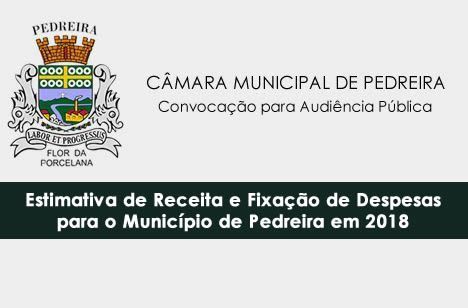 O PRESIDENTE DA CÂMARA MUNICIPAL DE PEDREIRA, JOSÉ LUIS NIERI, ATENDENDO O DISPOSTO NA CONSTITUIÇÃO FEDERAL E NO ART. 48 E SEU § 1º, INCISO I, DA LEI COMPLEMENTAR Nº 101/2000, convoca A COMUNIDADE EM GERAL PARA PARTICIPAR DA AUDIÊNCIA PÚBLICA A SER REALIZADA ÀS 10H (DEZ HORAS) DO DIA 31 DE OUTUBRO DE 2017 (TERÇA-FEIRA), NA SEDE DA CÂMARA MUNICIPAL DE PEDREIRA, SITUADA NA RUA PROFESSOR JOÃO ALVARENGA, 75, CENTRO, PEDREIRA – SP., COM O OBJETIVO DE INCENTIVAR A PARTICIPAÇÃO POPULAR NO PROJETO DE LEI Nº 74/17 – PREFEITO MUNICIPAL – Estima a Receita e Fixa a Despesa do município de Pedreira para o exercício financeiro de 2018, dando oportunidade AOS CIDADÃOS DE FORMULAR SUGESTÕES E OPINIÕES.